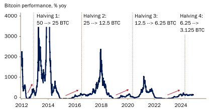Gráfico 3: El Bitcoin ha tenido un buen comportamiento tras los “halvings” anteriores