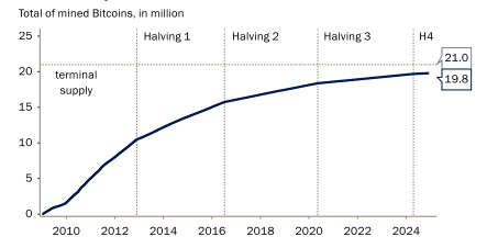 Por supuesto, el establecimiento de una reserva estratégica aún está lejos de consagrarse en la ley, pero la demanda adicional probablemente conduciría a un aumento del precio, dada la limitada oferta del Bitcoin, que induce escasez por construcción. Hasta la fecha, ya se han acuñado aproximadamente 19.8 millones de la oferta terminal (teórica) de 21 millones de Bitcoins y la tasa de producción ha disminuido visiblemente tras cada reducción a la mitad del Bitcoin (Gráfico 4). Además, se estima que alrededor del 8% de esta oferta se ha perdido definitivamente, dado que las claves de acceso digitales ya no son rastreables.