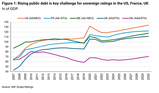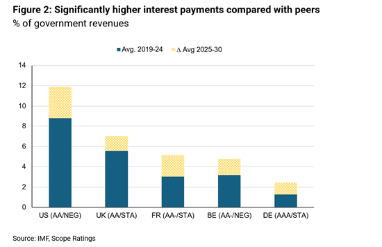 Las necesidades brutas de financiación son elevadas, del 38% del PIB este año, y seguirán siéndolo, con una media del 34% del PIB en 2026-30, la más alta de cualquier prestatario soberano con calificación Scope, excepto la de Japón (A/Estable).