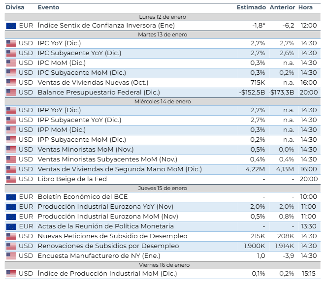 De cara a esta semana, la atención de los inversores se centrará en una agenda macroeconómica especialmente relevante. En Estados Unidos, destacan la publicación del IPC de diciembre, las ventas minoristas y el Libro Beige de la Reserva Federal, que ofrecerá una visión cualitativa sobre la evolución de la actividad económica. En la eurozona, el foco estará en las actas de la reunión de política monetaria, el boletín económico del BCE y los datos de producción industrial, que permitirán evaluar la solidez del reciente repunte de la actividad.