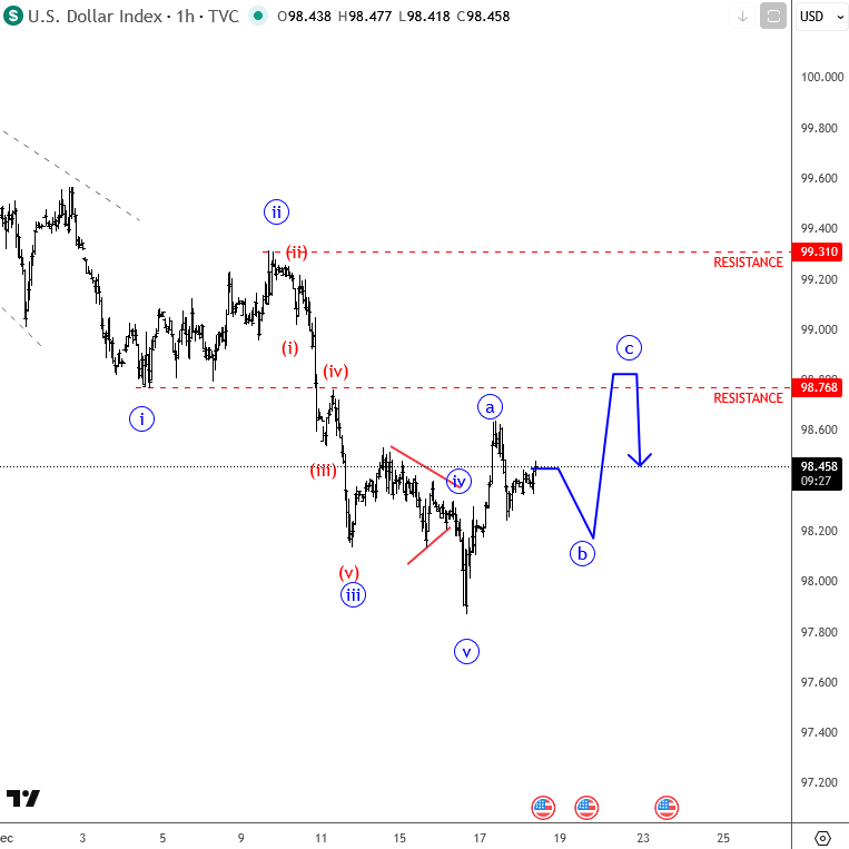 Mirando el Índice del Dólar, ya estamos en una fase de recuperación desde los mínimos de ayer, que sospecho se desarrollará en tres ondas. Idealmente, este rebote podría llevarnos de vuelta hacia el área de 98,73, que es la primera resistencia importante, y si se extiende más, entonces los niveles alrededor de 99 a 99,30 entran en foco. La idea clave es que esto aún parece un rebote correctivo temporal dentro de una estructura bajista más amplia, y por ahora el movimiento al alza parece incompleto.