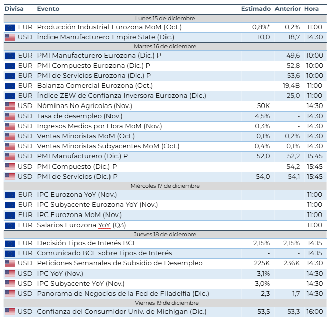 En este contexto, la evolución del EUR/USD en el corto plazo estará estrechamente condicionada por las referencias macroeconómicas clave de la semana. En la eurozona, el foco de esta semana se sitúa en la reunión del Banco Central Europeo. El mercado descuenta prácticamente por unanimidad que el BCE mantendrá los tipos de interés en el 2.15%, con una probabilidad cercana a cero de un recorte adicional. La inflación se encuentra ya próxima al objetivo del 2%, lo que permite al BCE adoptar una postura de espera y evaluar la evolución del crecimiento y de las condiciones financieras antes de realizar nuevos ajustes. También se publicarán los datos del IPC de la Eurozona y los datos de salarios del tercer trimestre, que permitirán evaluar la evolución de las presiones inflacionarias.