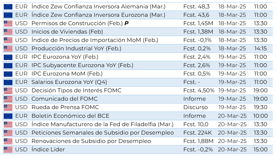 Los inversores centrarán su atención esta semana en la decisión de tipos de la Reserva Federal del miércoles, donde se espera que mantenga los tipos de referencia en 4.50%. La atención estará puesta en el discurso de Jerome Powell, clave para evaluar el rumbo de la política monetaria ante la presión inflacionaria derivada de la guerra comercial de Trump.
