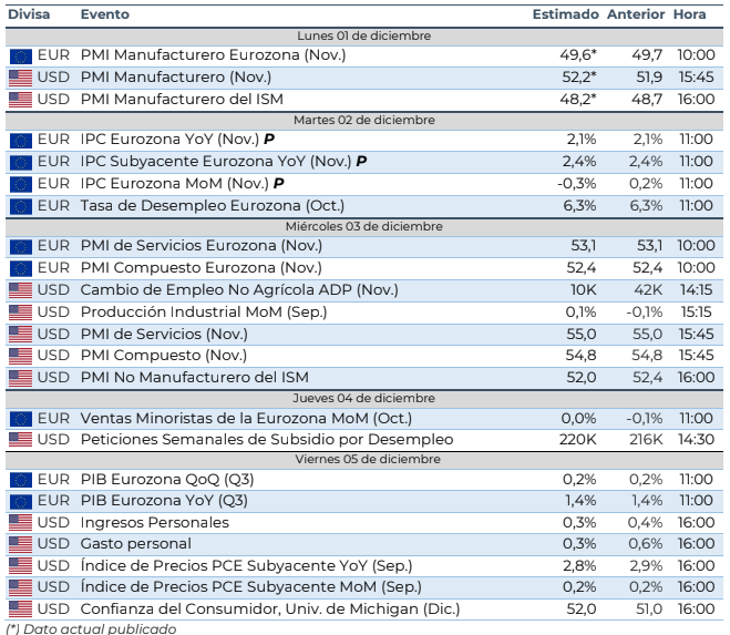 En la Eurozona, la semana viene marcada por la publicación del IPC de noviembre, fundamental para calibrar el margen de actuación del BCE, además de la actualización del PIB del tercer trimestre y las ventas minoristas, que permitirán evaluar la resiliencia del consumo interno en el bloque. Finalmente, los PMIs a ambos lados del Atlántico ofrecerán nuevas señales sobre el pulso de la actividad y el ritmo de desaceleración o recuperación de las economías desarrolladas.