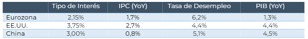 En la Eurozona, el Banco Central Europeo mantuvo los tipos de interés en el rango 2.00%-2.15%, reafirmando su enfoque dependiente de los datos y evitando comprometerse con un calendario claro de recortes. En materia de inflación, el IPC se situó en el 1.7%, por debajo del 2.0% anterior y dentro del rango compatible con el objetivo del BCE. Esta moderación de los precios contribuye a sostener el poder adquisitivo de los hogares y, de prolongarse en el tiempo, podría traducirse en una mejora gradual del consumo privado.