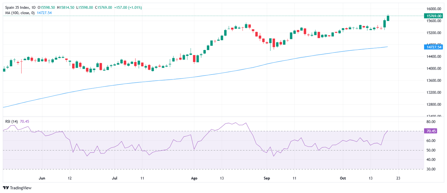 La tendencia del Ibex 35 se mantiene al alza a corto, medio y largo plazo, aunque el Índice de Fuerza Relativa (RSI) de 14 días muestra la cotización muy sobrecomprada en los gráficos un día y cuatro horas, por lo que podríamos ver una corrección en los próximos días.