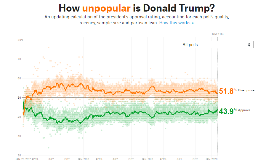 Según FiveThirtyEight, el índice de aprobación de Trump es de 43.9%, mientras que hay más personas desaprueban su desempeño, el 51.8% según el sitio web, el más alto desde justo después de su inauguración a principios de 2017.