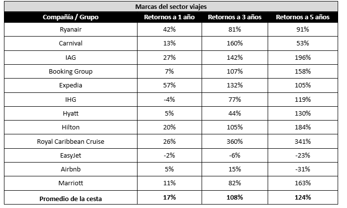 Tabla que muestra el rendimiento de una cesta de acciones relacionadas con viajes