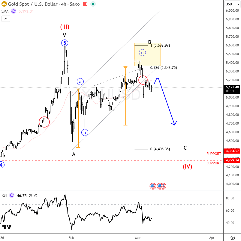 Esto sugiere que el mercado podría estar posicionado para una mayor debilidad, especialmente si la línea de tendencia previamente rota ahora se convierte en resistencia alrededor de 5200. Seguimos pensando que una corrección de onda cuatro de mayor grado está en curso desde los máximos de enero, y hay una buena posibilidad de que el precio continúe moviéndose hacia el lado inferior de este rango.