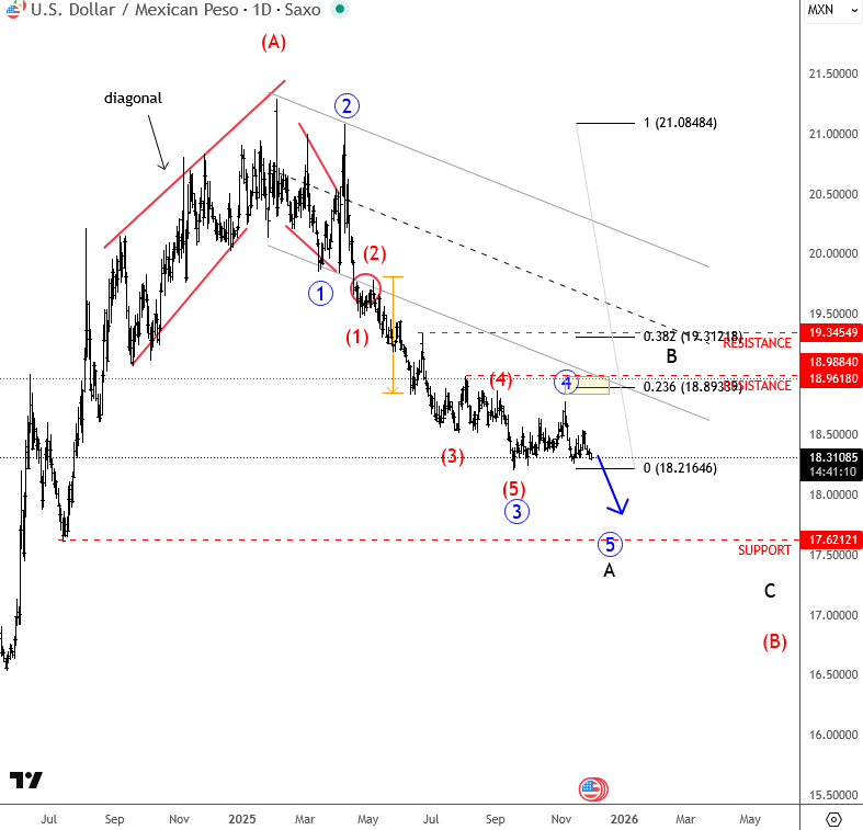 Corrección A-B-C de mayor grado a la baja desde los máximos de 2020. Creemos que la primera parte de 2025 puede ser una reversión bajista para el USDMXN, bajando hacia la onda (B)
