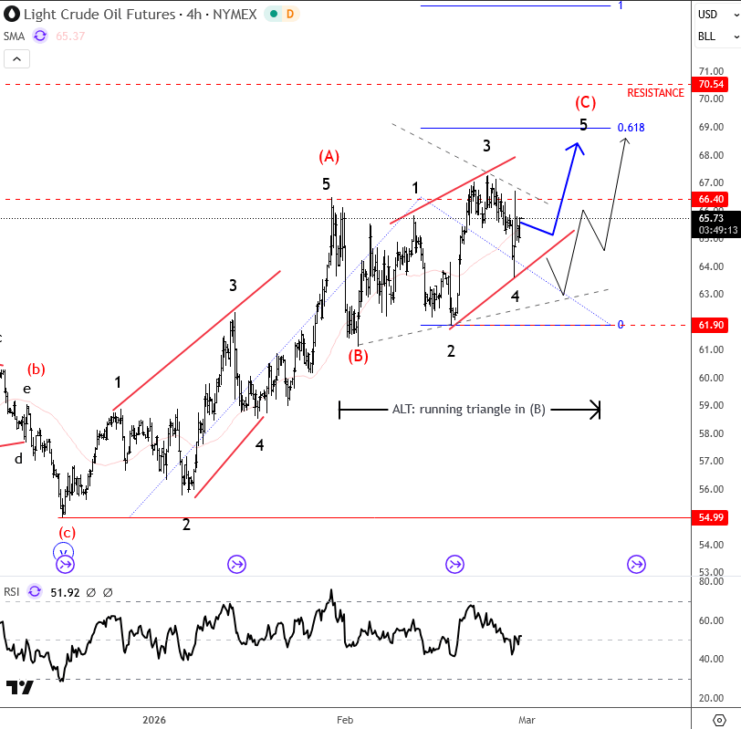 El petróleo crudo ha visto una fuerte recuperación desde los mínimos de diciembre, con el movimiento superpuesto, pero aún se puede contar en cinco ondas como una posible diagonal líder en la onda (A). Y después del reciente movimiento correctivo en la onda (B), que puede haber terminado, debemos estar atentos a un poco más de alza dentro de la onda (C) hacia el área de 69/70 donde los toros pueden comenzar a desacelerarse si consideramos que esto puede ser una diagonal final, una última pierna de una recuperación de tres ondas desde los mínimos de 55. Además, ten en cuenta que en el actual rally diario puede ser parte de una corrección compleja de mayor grado, con un mercado en rango desde mayo del año pasado. Su onda B que puede ser un triángulo o un plano