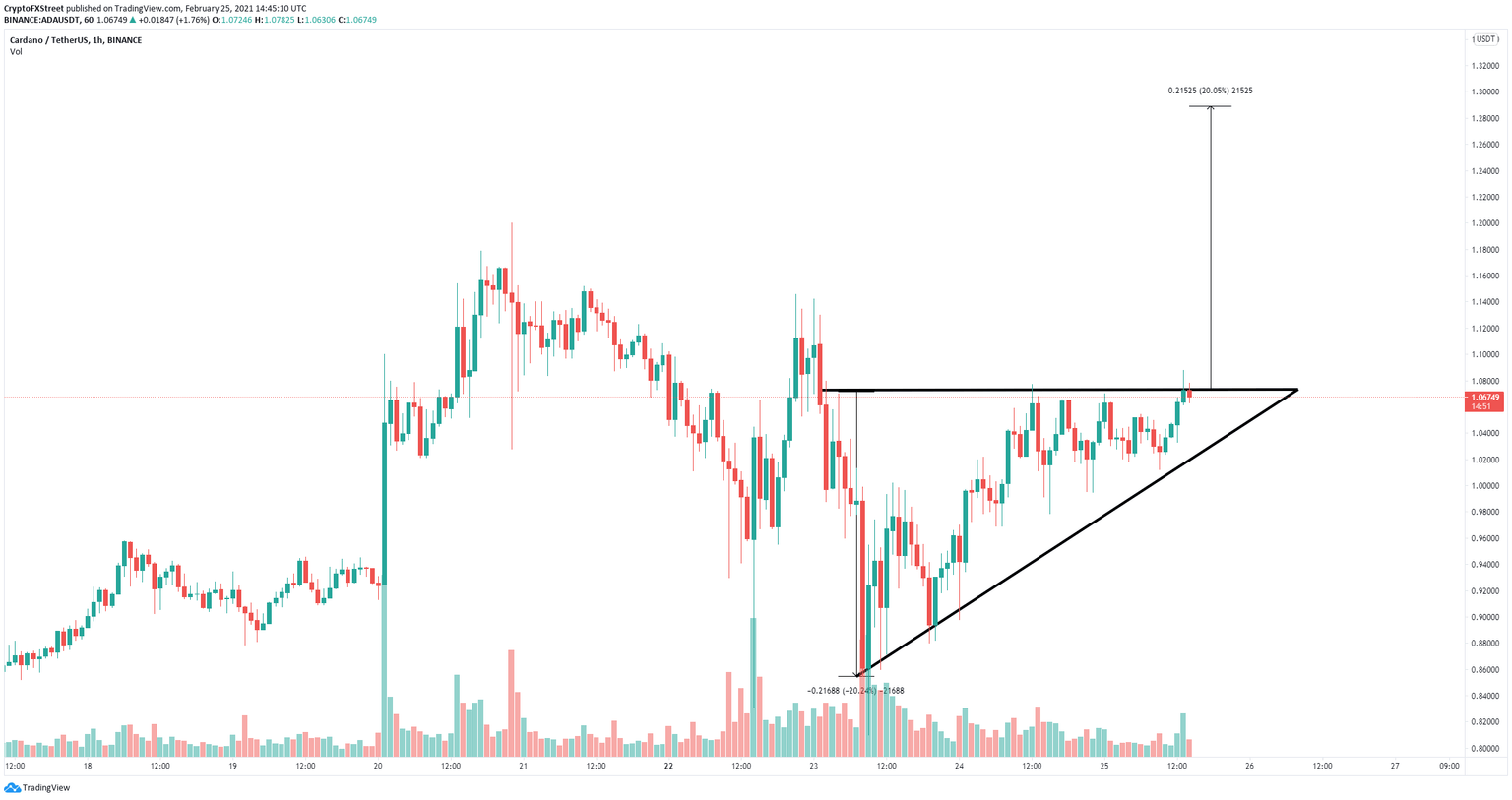 En el gráfico de 1 hora, Cardano ha establecido un patrón de triángulo ascendente que está a punto de romperse. El nivel de resistencia más importante se encuentra en $1.08 dólares. La superación de este nivel puede empujar fácilmente el precio de Cardano hacia los $1.29 dólares, un movimiento del 17% calculado utilizando la altura máxima del patrón como punto de referencia.