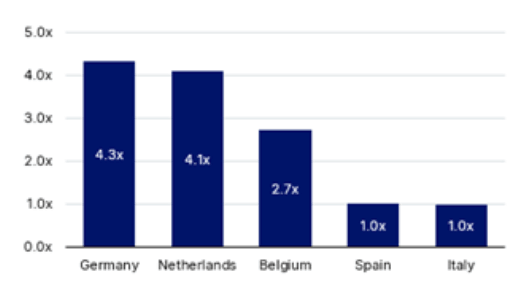 En cambio, Alemania y los Países Bajos gastarán varias veces esa cantidad, entre 4 y 4.5 euros por cada euro de activos existentes. En el caso de Bélgica, la cifra ronda los 2.7 euros (Gráfico 1).