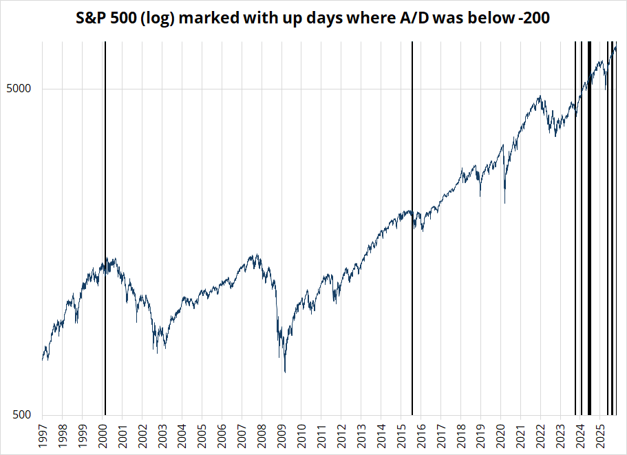 La línea de avance/declinación (A/D) ayer fue de -294. Para darte una idea de la situación de amplitud, aquí están todas las veces que tuviste un día positivo en SPX con A/D por debajo de -200.