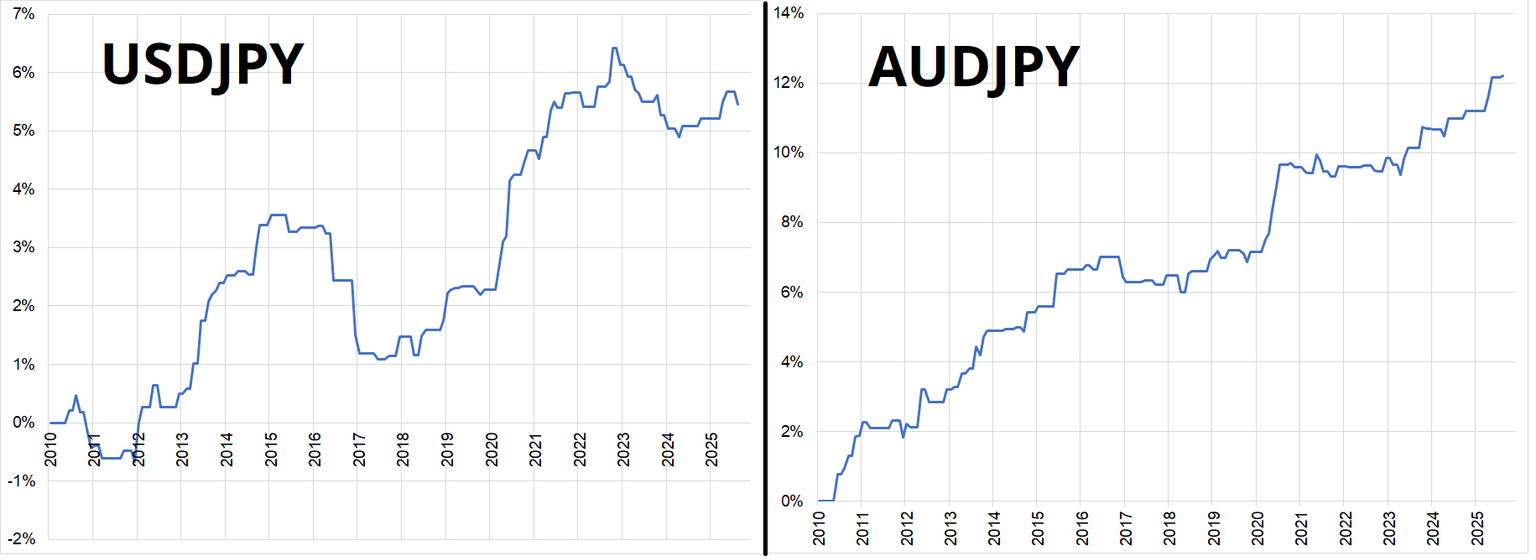 - El final de mes corporativo debería ser una compra de USDJPY, mientras que el final de mes real (viernes) también debería ser un cruce RHS/JPY. Estos dos gráficos muestran cómo se comportan USDJPY y AUDJPY en las cuatro horas previas a la fijación de fin de mes (4 p.m. Londres) en meses donde el S&P y el NASDAQ suben un 5% o más en conjunto.