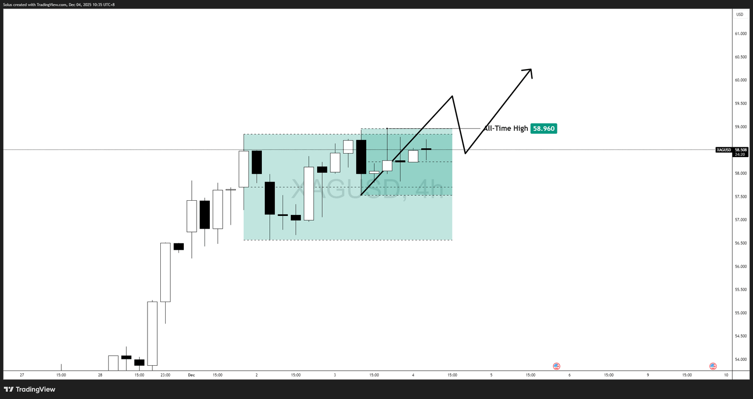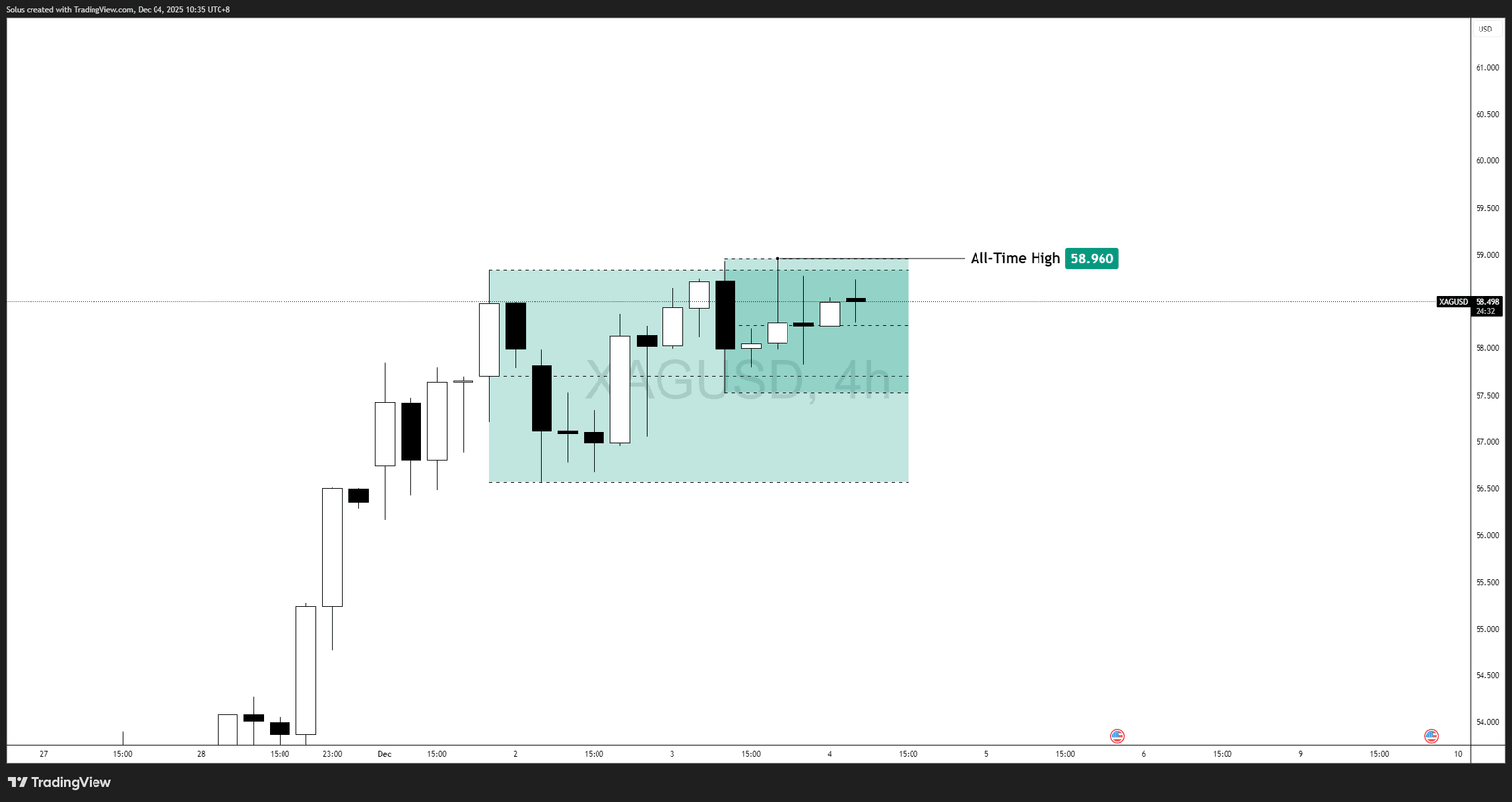 En las últimas sesiones, el XAGUSD imprimió una poderosa estructura parabólica, superando resistencias de larga data y presionando hacia nuevos máximos históricos cerca de 58.95$.