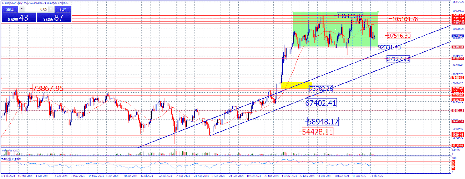 La volatilidad que se ha instalado en el Bitcoin está siendo impresionante y lo lleva a un proceso de lateralización en la parte de distribución con resistencia en los niveles de 105.000$ y soportes en 92.700$, con una volatilidad diaria que supera de media los 3.000 puntos.