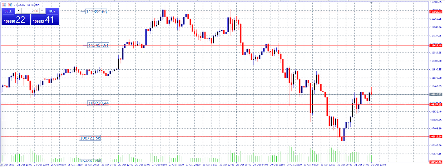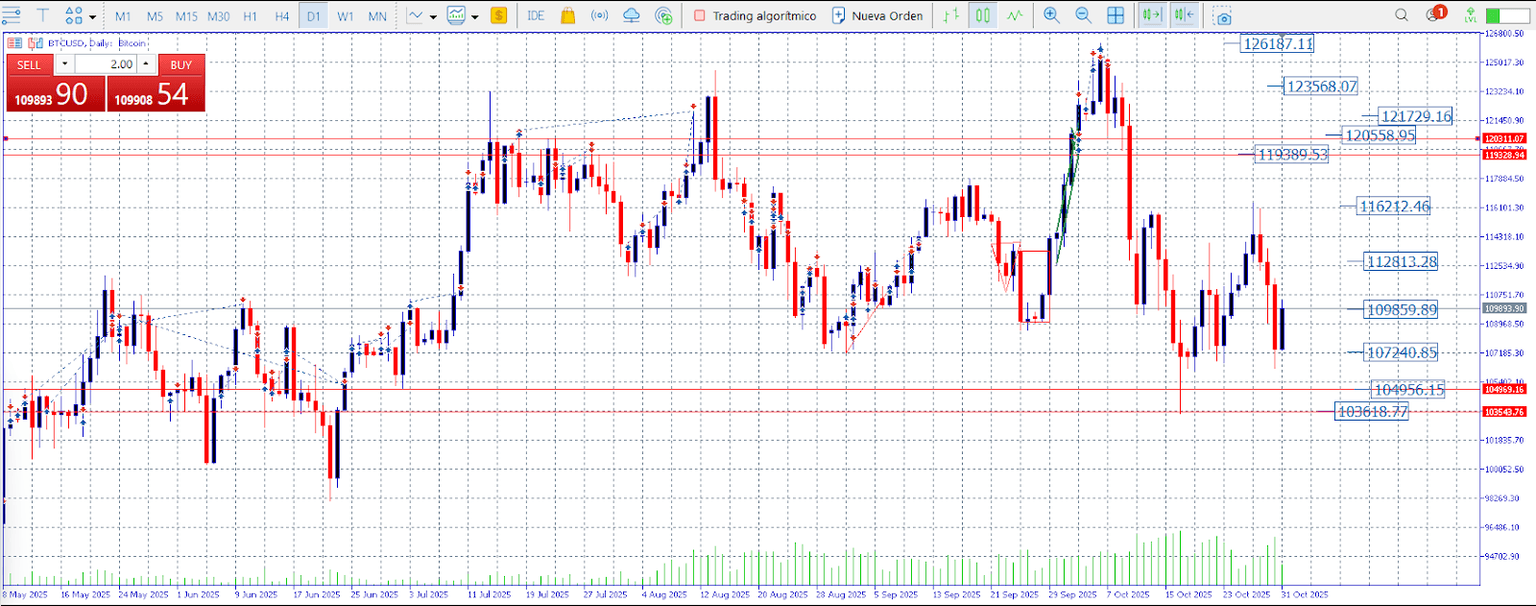 Octubre vuelve a ser un mes importante para el Bitcoin, el día 6 de octubre marcó su máximo histórico en 126.185$, donde retrocedió con fuerza hasta alcanzar 103.460$ el 17 de octubre, lo cual constituye una bajada de alrededor de 23.000 puntos en 11 sesiones.
