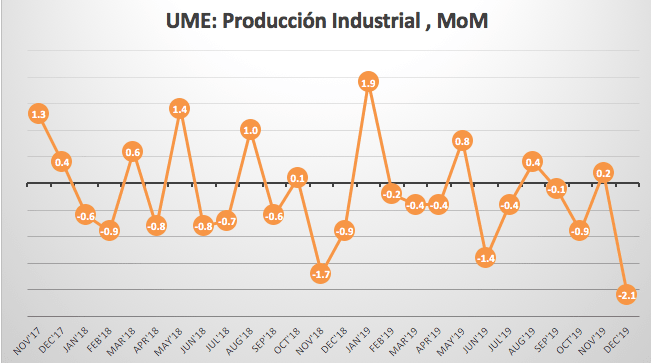 La moneda única ha visto acelerar la trayectoria bajista ayer miércoles luego que la producción industrial en la zona euro haya decepcionado nuevamente a los inversores durante el mes de diciembre y confirmando que el sector se encuentra sumido en el territorio contractivo y sin vistas de mejora por lo menos en el corto plazo.