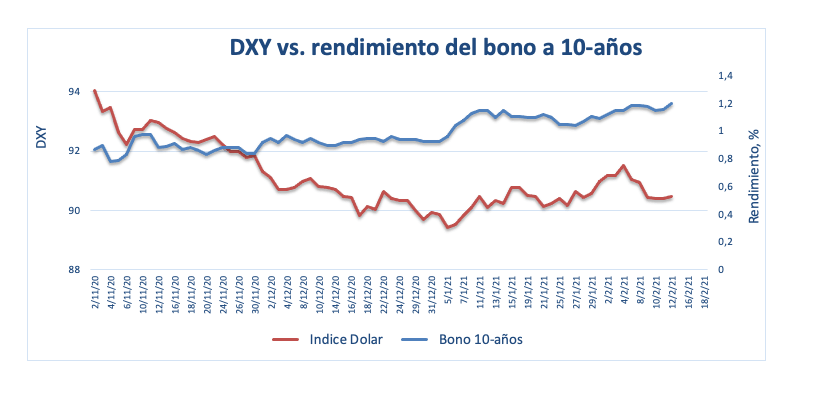 El billete verde, sin embargo, parece haberse desentendido de la performance de las tasas de rendimiento en el mercado de deuda americano, ya que no ha seguido el camino ascendente de la tasa del bono de referencia a 10 años, que ha testeado la zona de 1.25%, nivel observado por última vez allá por marzo de 2020.