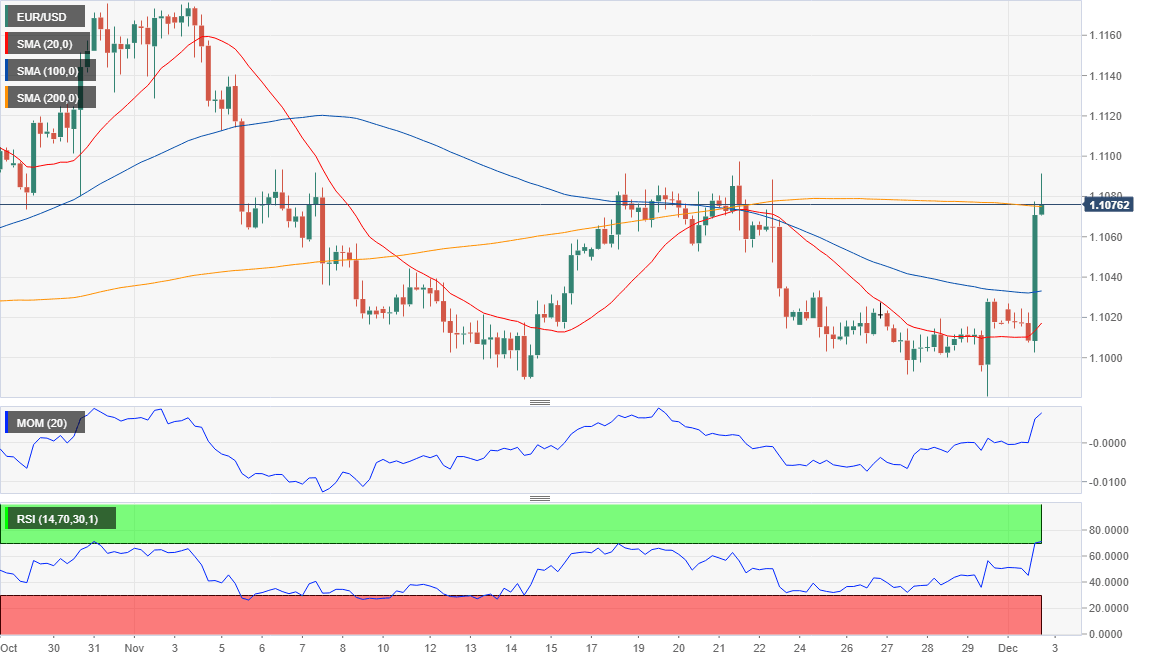 El EUR/USD está terminando el día por encima de 1.1065, el retroceso del 38.2% de su repunte de octubre. La semana pasada, el par atravesó brevemente el retroceso del 61.8% de la misma carrera, y las ganancias constantes desde aquí deberían tomarse como una pista alcista. El gráfico de 4 horas muestra que el par ahora está luchando con su SMA de 200 sin dirección después de superar sus SMA de 100 y 200, mientras que los indicadores técnicos siguen yendo hacia el norte en terreno positivo, manteniendo el riesgo sesgado al alza. El par podría sufrir un giro en U abrupto si las tensiones persisten, con el riesgo cambiando a la baja con una ruptura por debajo de 1.1030.