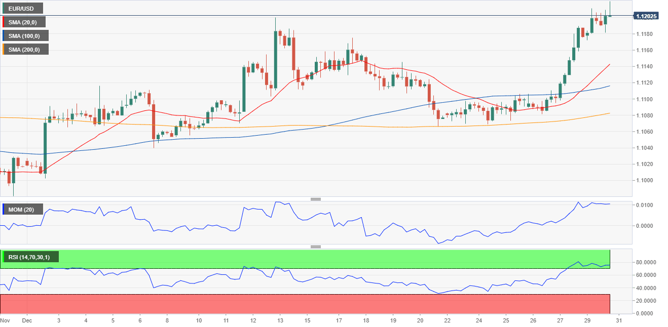 El par EUR/USD cotiza cerca del máximo mencionado, conservando su posición alcista de acuerdo con las lecturas técnicas intradía. El par tiene varios máximos relevantes en la zona de precios de 1.1230/40, lo que proporciona resistencia, aunque podría superar fácilmente el nivel en las condiciones actuales del mercado debilitado. En el gráfico de 4 horas, los indicadores técnicos se dirigen hacia el norte, a pesar de estar en niveles extremos de sobrecompra. El par, mientras tanto, continúa avanzando por encima de todos sus promedios móviles, con la SMA de 20 encabezando firmemente por encima de las más largas.