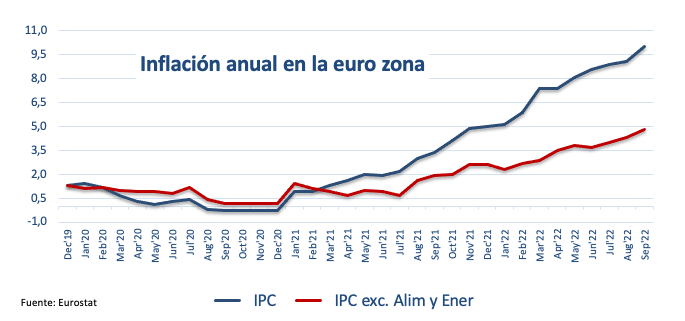 En el calendario europeo hoy viernes, la tasa de paro en Alemania se ha mantenido en el 5.5% en septiembre y el desempleo ha aumentado en 14K personas durante el mismo periodo. En lo que ha sido el evento saliente de la jornada, las cifras preliminares de inflación en la zona euro ven al IPC avanzando 10% en términos anuales durante septiembre y 4.8% cuando se excluyen los costos de alimentación y energía.