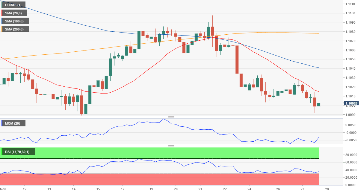 El par EUR/USD ha flirteado con el retroceso del 61.8% de su repunte de octubre antes de estabilizarse alrededor de 1.1000, donde se encuentra de cara a la apertura asiática. El riesgo sigue siendo sesgado a la baja, según el gráfico de 4 horas, ya que el precio continúa desarrollándose por debajo de todos sus promedios móviles, con las SMA de 20 y 100 acelerando sus caídas. Los indicadores técnicos carecen de fuerza direccional, el impulso dentro de los niveles neutrales y el RSI cerca de las lecturas de sobreventa. Dados los bajos volúmenes esperados para el fin de semana, el par podría romper falsamente el área de soporte de 1.0990 sin desencadenar una extensión bajista.