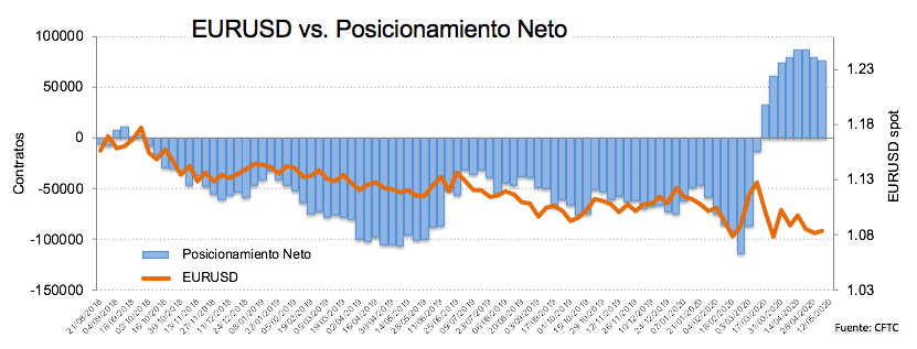 Desde la comunidad especulativa, las posiciones netas compradoras en el euro han caído a mínimos de 5-semanas durante la semana finalizada el 5 de mayo de acuerdo con el último reporte de posicionamiento elaborado por CFTC. Lo inversores parecen haber incorporado a sus perspectivas alguna que otra preocupación luego que la corte alemana haya puesto en dudas la constitucionalidad en el país de las compras del Banco Central Europeo en su programa de ‘expansión cuantitativa’ desde 2015.