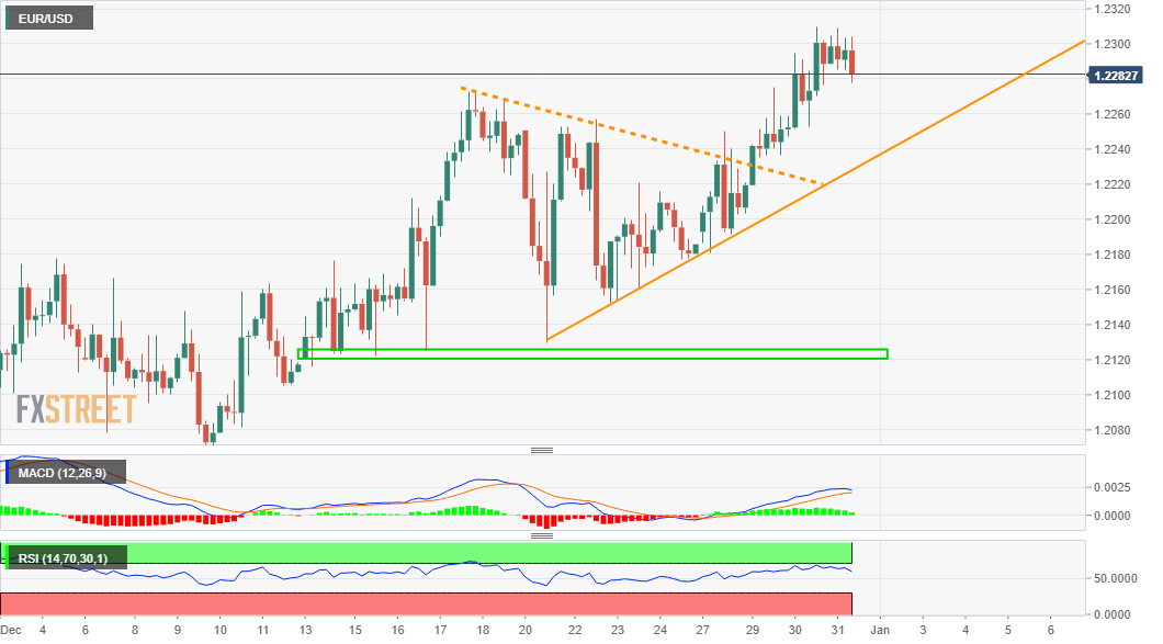 El par EUR/USD oscila en una banda de negociación estrecha durante la sesión europea, consolidando sus recientes fuertes ganancias al nivel más alto desde abril de 2018 en 1.2310. En ausencia de un nuevo catalizador fundamental, los alcistas hicieron una breve pausa y se abstuvieron de hacer nuevas apuestas en medio de los escasos volúmenes de operaciones de fin de año. Dicho esto, el sesgo de venta sostenido en torno al dólar estadounidense debería ayudar a limitar la caída, más bien respalda las perspectivas de un nuevo movimiento de apreciación a corto plazo.