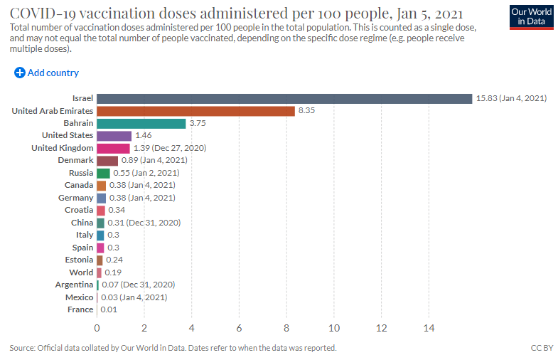 Estados Unidos vacunó solo alrededor del 1.5% de su población, Alemania el 0.4%, mientras que Israel superó el 15%.