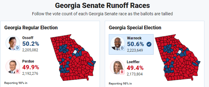 Al momento de escribir este artículo, las redes proclamaron al demócrata Rapahel Warnock el ganador contra la republicana Kelly Loeffler. En la segunda carrera electoral, el senador republicano David Perdue está detrás del demócrata Jon Ossof por solo un 0.29%, pero los votos restantes son de condados de tendencia demócrata. Los resultados adicionales se publicarán más tarde en el día.