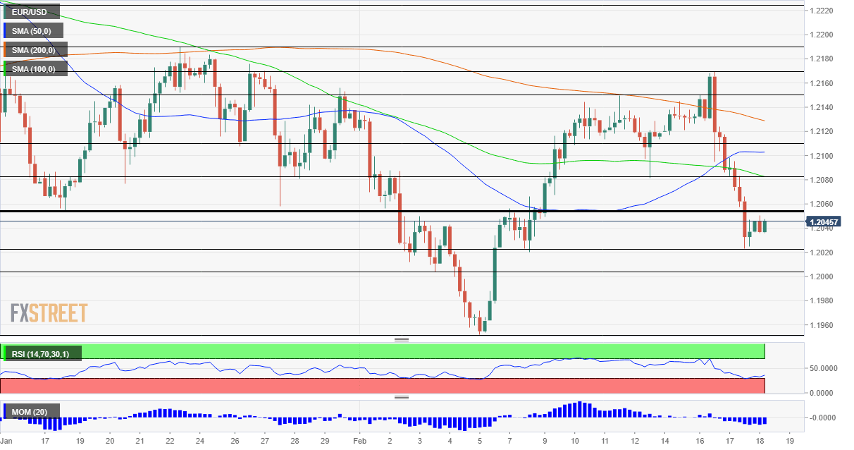 Los bajistas han tomado el control – el euro/dólar ha caído por debajo de 1.2055, que ha estado sirviendo como separador de rangos desde mediados de enero. El par de divisas se encuentra ahora en el lado inferior de esta barrera crítica. Además, el impulso en el gráfico de cuatro horas es a la baja y el EUR/USD cotiza por debajo de las medias móviles simples de 50, 100 y 200.