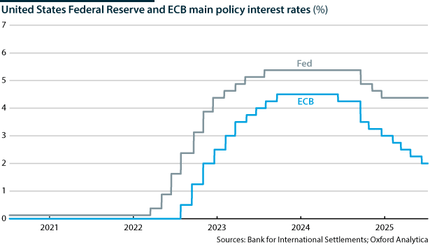 El Banco Central Europeo (BCE) mantuvo el camino establecido en 2024 y redujo las tasas de interés ocho veces entre junio de 2024 y junio de 2025, reduciendo la tasa de interés de las operaciones principales de refinanciación, los tipos de interés de la facilidad marginal de crédito y la facilidad de depósito al 2.15%, 2.4% y 2%, respectivamente.