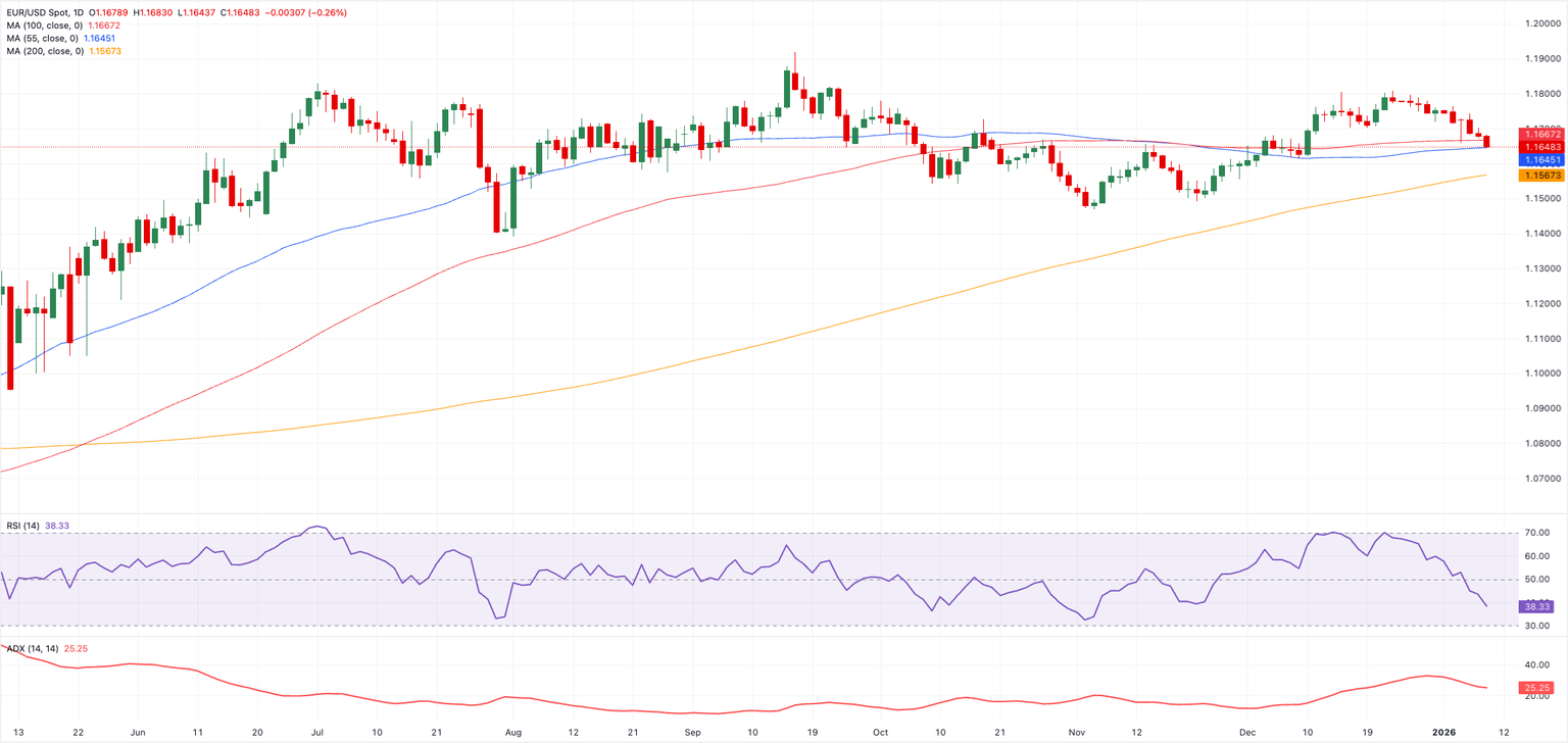 El par se desliza por tercera sesión consecutiva el jueves, rompiendo por debajo del nivel de 1.1650 y comenzando a apoyarse en su SMA de 55 días interina cerca de 1.1640. El movimiento encaja perfectamente con el tono bajista más amplio que se ha establecido desde el pico de diciembre por encima del área de 1.1800.