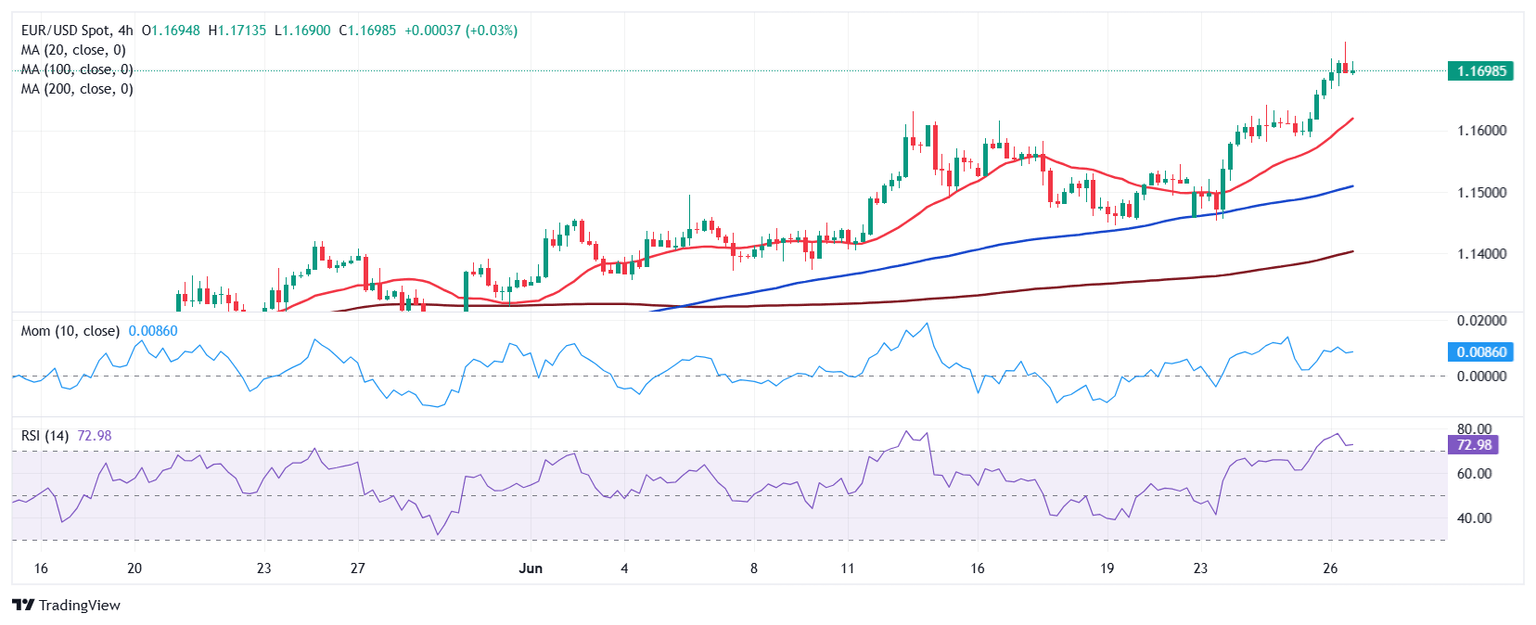 El par EUR/USD alcanzó un máximo de 1.1741 durante las horas de negociación europeas, su nivel más alto desde septiembre de 2021. Actualmente ronda la marca de 1.1700, y el gráfico diario muestra que el potencial alcista se mantiene intacto mientras el par avanza por sexto día consecutivo. Los indicadores técnicos apuntan firmemente al norte, con el indicador del Índice de Fuerza Relativa (RSI) entrando en territorio de sobrecompra sin signos de agotamiento al alza. Al mismo tiempo, las medias móviles se mantienen muy por debajo del nivel actual y están subiendo, reflejando el dominio de los compradores. La media móvil simple (SMA) de 20 se sitúa actualmente en torno a 1.1500.