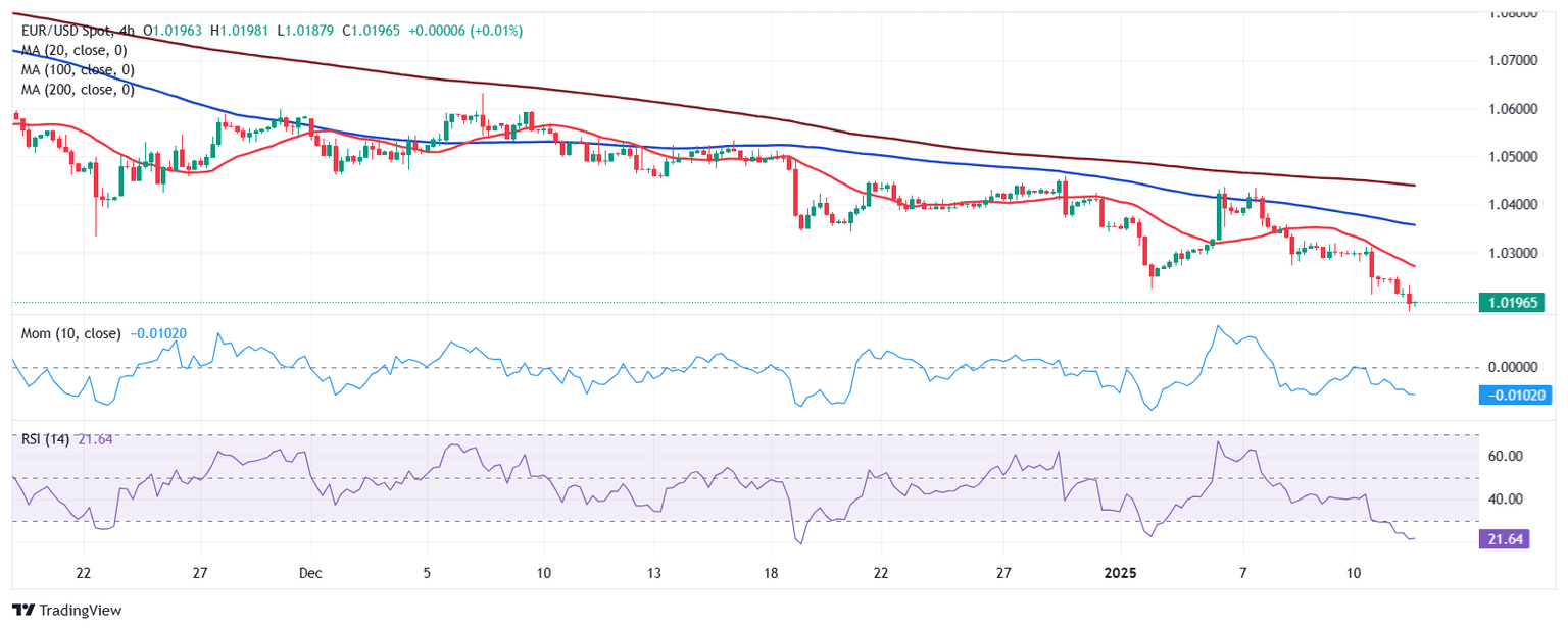 El par EUR/USD cayó a nuevos mínimos de varios meses, cotizando por debajo del nivel de 1.0200 por primera vez desde noviembre de 2022. El Dólar estadounidense (USD) dejó un gap alcista en la apertura semanal, manteniendo el impulso desencadenado el pasado viernes por el informe de Nóminas no Agrícolas (NFP). El informe mensual de empleo de Estados Unidos (EE.UU.) mostró que el mercado laboral en la economía más grande del mundo se mantuvo fuerte en diciembre mientras que las presiones salariales disminuyeron. Las cifras dieron a la Reserva Federal (Fed) mucho margen antes de recortar las tasas de interés nuevamente.