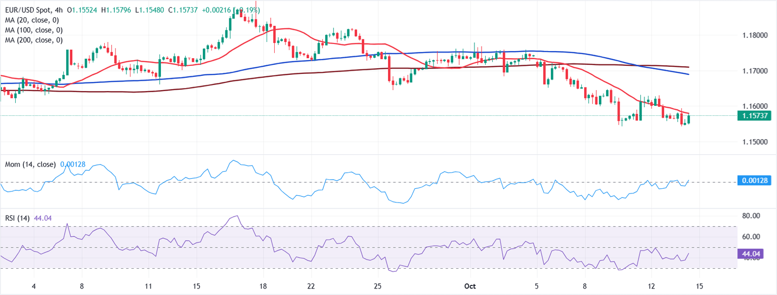 El gráfico de 4 horas muestra que una SMA de 20 bajista limita el alza para el par EUR/USD, actualmente en torno a 1.1590. Al mismo tiempo, una SMA de 100 bajista está cruzando por debajo de una SMA de 200 plana, ambas muy por encima del nivel actual y apoyando la tendencia bajista. Finalmente, los indicadores técnicos se han recuperado de sus recientes mínimos, apuntando hacia arriba pero aún dentro de niveles negativos, no suficientes para apoyar una recuperación a corto plazo.