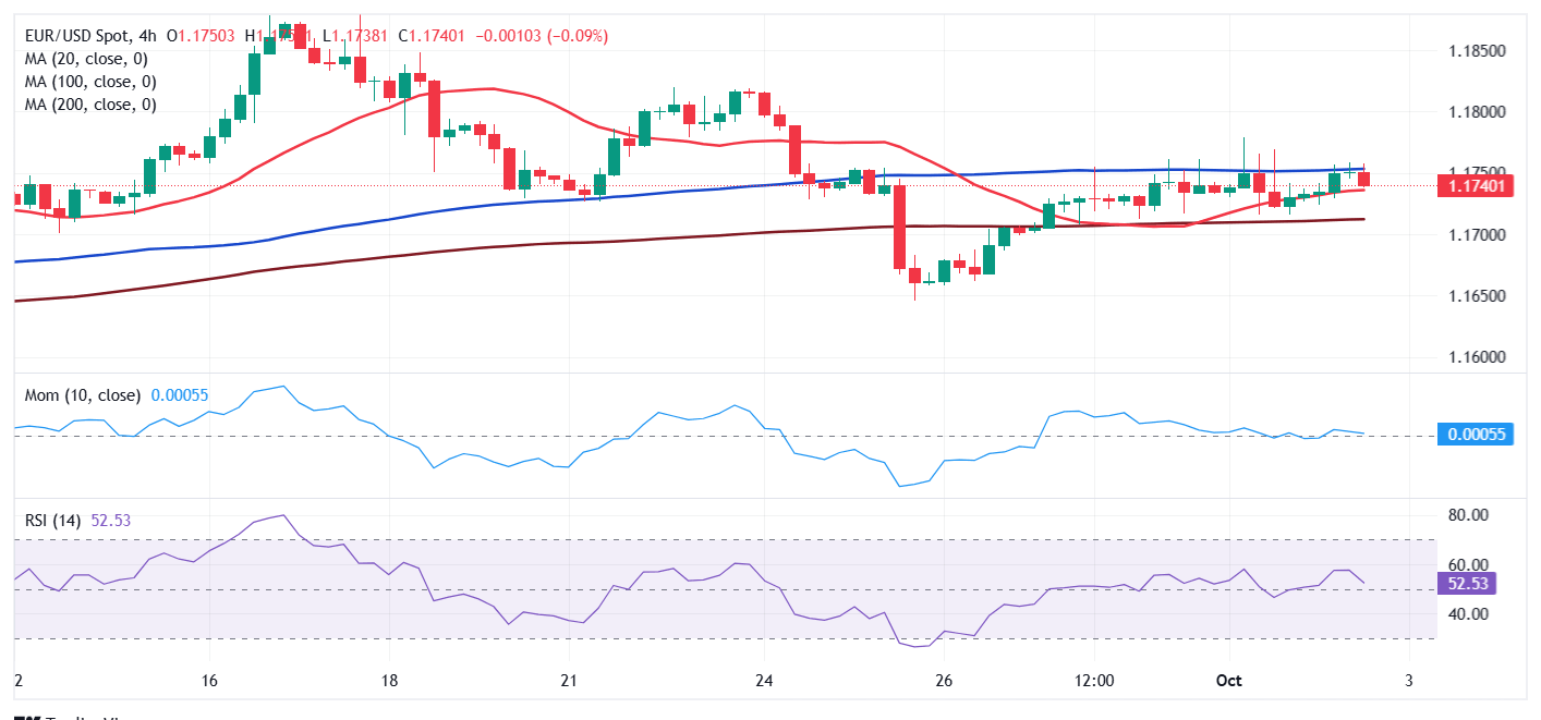 El gráfico de 4 horas del par EUR/USD muestra que los vendedores permanecen alineados alrededor de una SMA de 100 plana, mientras que los compradores defienden la parte baja alrededor de una SMA de 200 también sin dirección. La SMA de 20, mientras tanto, se encuentra plana a mitad de camino entre las más largas. Finalmente, el indicador Momentum retrocede después de cruzar su línea media hacia territorio positivo, mientras que el indicador del Índice de Fuerza Relativa (RSI) también apunta a la baja en torno a 51, sugiriendo un interés especulativo limitado alrededor del par.