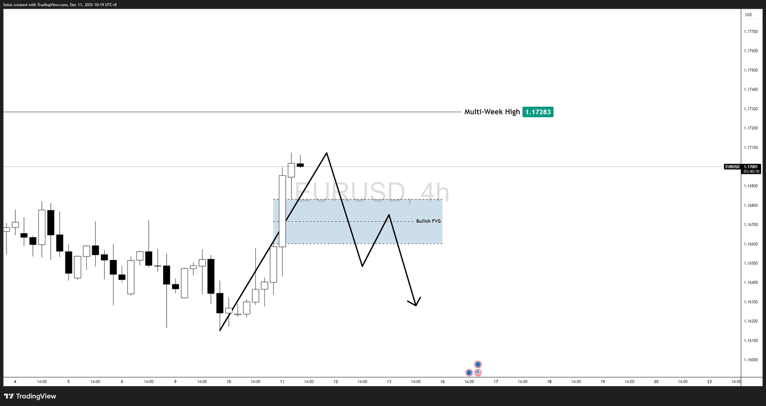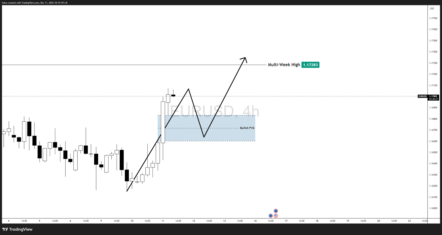 - El precio retrocede hacia el FVG alcista de 4H (zona de 1.1650–1.1675)