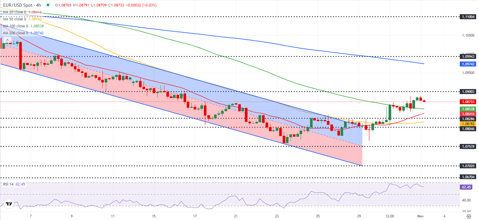 El EUR/USD cerró el cuarto día consecutivo en territorio positivo el jueves antes de entrar en una fase de consolidación por debajo de 1.0900 el viernes. Al inicio de la sesión americana, los datos de empleo de octubre de Estados Unidos (EE.UU.) serán observados de cerca por los participantes del mercado.