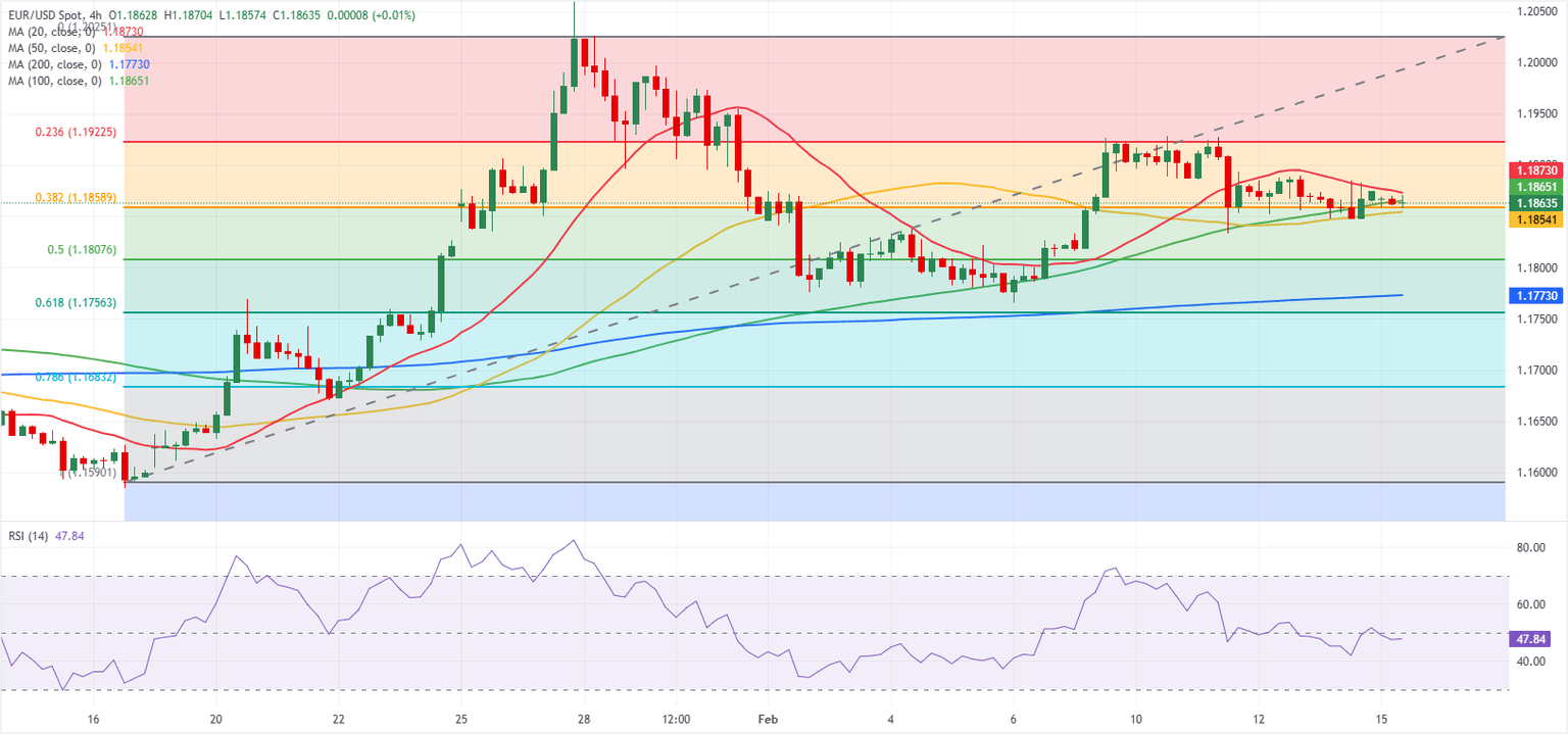 El indicador del Índice de Fuerza Relativa (RSI) en el gráfico de 4 horas se mueve lateralmente ligeramente por debajo de 50 y el EUR/USD fluctúa alrededor de las SMAs de 20, 50 y 100 periodos, reflejando la indecisión del par.
