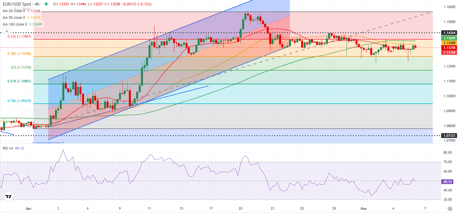 El indicador del Índice de Fuerza Relativa (RSI) en el gráfico de 4 horas se mantiene cerca de 50 y el EUR/USD continúa fluctuando alrededor de la media móvil simple (SMA) de 20 períodos, destacando la falta de impulso direccional.