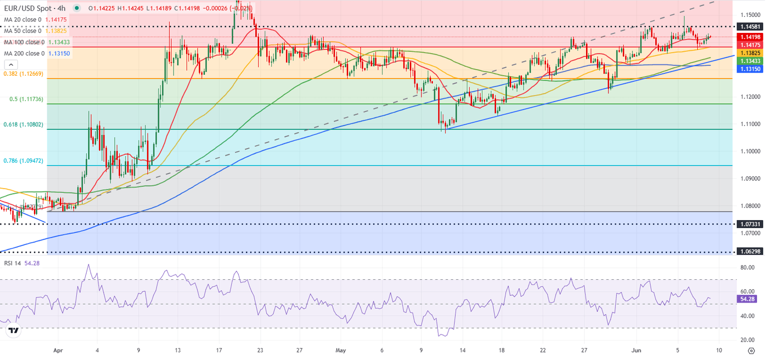 El indicador del Índice de Fuerza Relativa (RSI) en el gráfico de 4 horas se mantiene ligeramente por encima de 50 y el EUR/USD fluctúa alrededor de la media móvil simple (SMA) de 20 períodos, lo que sugiere que el sesgo alcista se mantiene intacto pero carece de impulso.