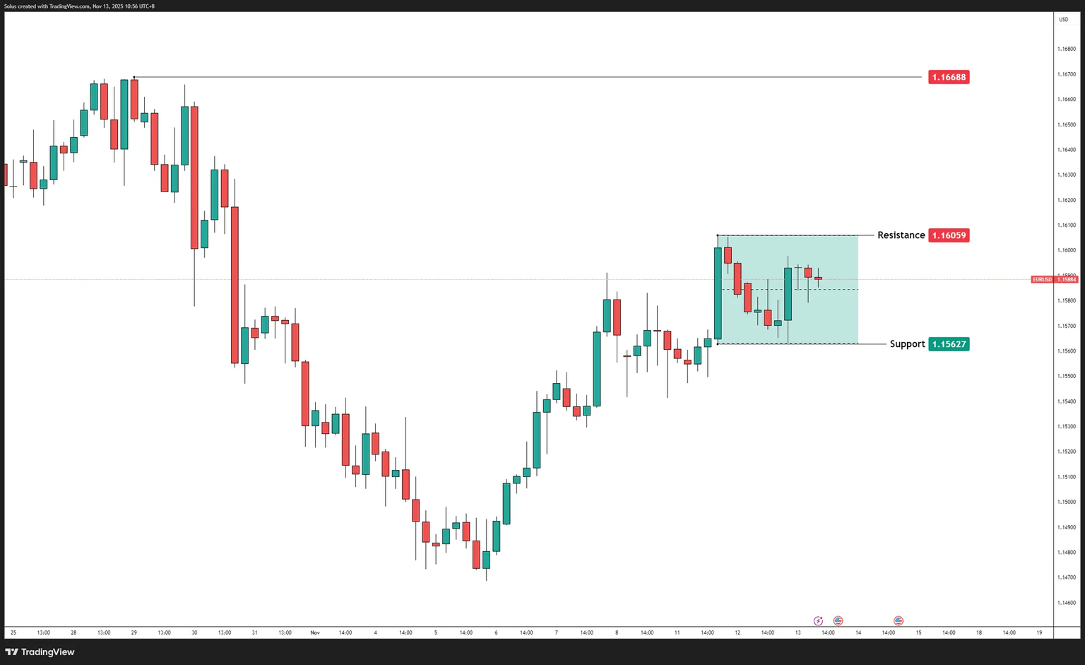 El EURUSD continúa cotizando dentro de un rango de consolidación estrecho, con el gráfico mostrando límites claros en resistencia de 1.16059 y soporte de 1.15627. Esta estructura lateral refleja la vacilación y la falta de convicción tanto de compradores como de vendedores, especialmente con la publicación del IPC de EE.UU. retrasada una vez más.