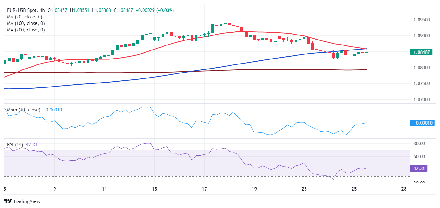 El par EUR/USD registra modestas ganancias intradía, luchando por extender las ganancias más allá de la zona de 1.0850. En el gráfico diario, el par está atrapado alrededor de una media móvil simple (SMA) de 20 días alcista, mientras que las medias móviles más largas permanecen sin dirección, justo por debajo de la marca de 1.0800. Finalmente, los indicadores técnicos han perdido sus pendientes bajistas justo por encima de sus líneas medias, indicando un interés de venta decreciente.