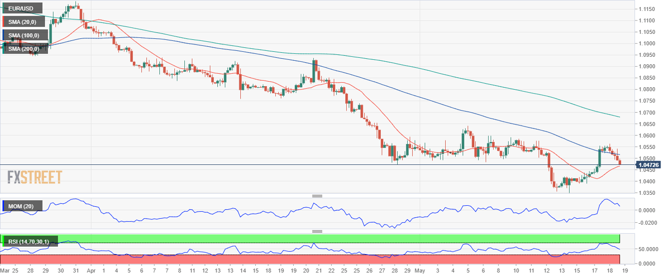 El par EUR/USD bajó el miércoles y terminó el día cerca de un mínimo diario en 1.0475. El par retrocedió desde un máximo semanal de 1.0563, ya que el estado de ánimo del mercado empeoró a mediados de la sesión europea tras la publicación de las cifras de inflación. El crecimiento del índice de precios al consumo de la UE se confirmó en el 7.4% interanual en abril, modestamente por debajo de la estimación preliminar del 7.5%, aunque la inflación subyacente se revisó al alza hasta el 3.5% desde el 3%.