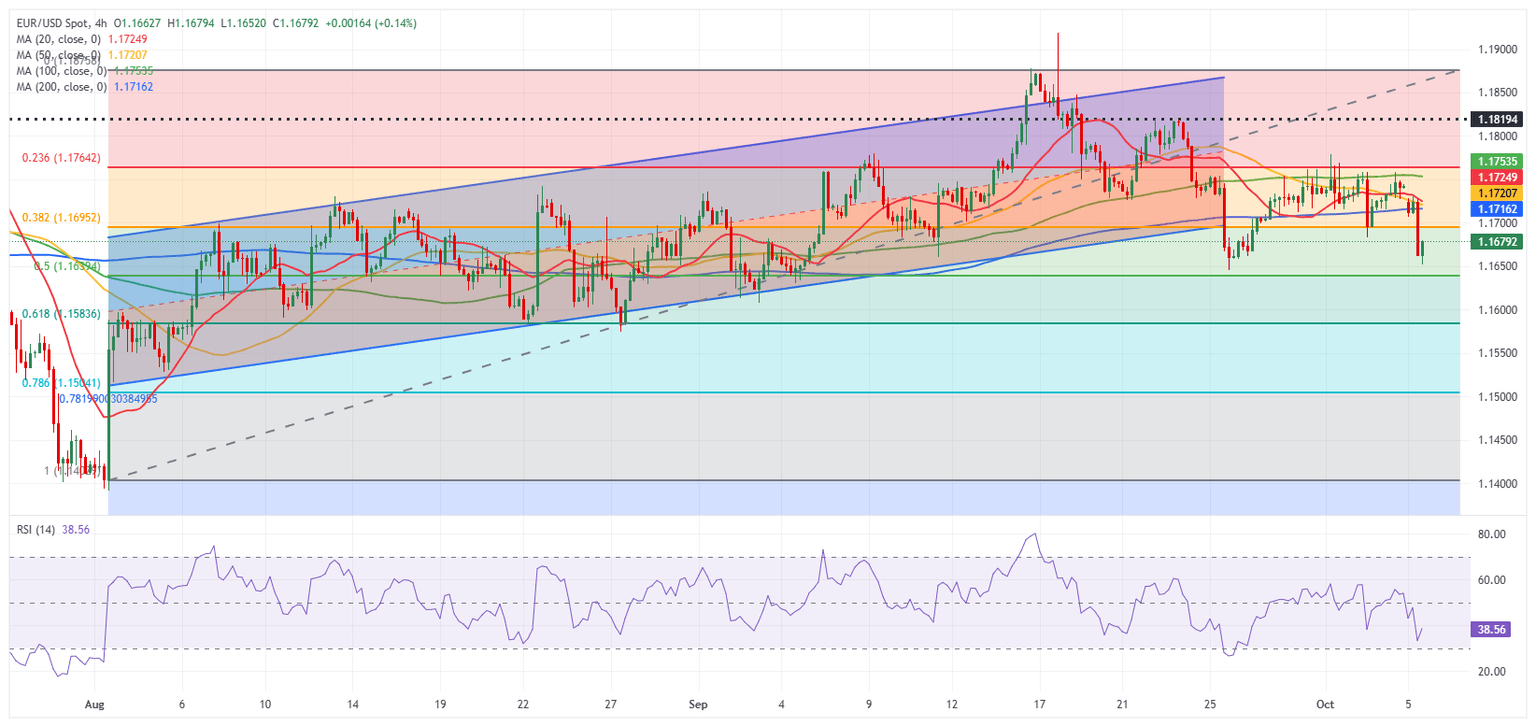 El indicador del Índice de Fuerza Relativa (RSI) en el gráfico de 4 horas cayó por debajo de 40 y el EUR/USD atravesó la media móvil simple (SMA) de 200 periodos, reflejando una acumulación de momentum bajista.