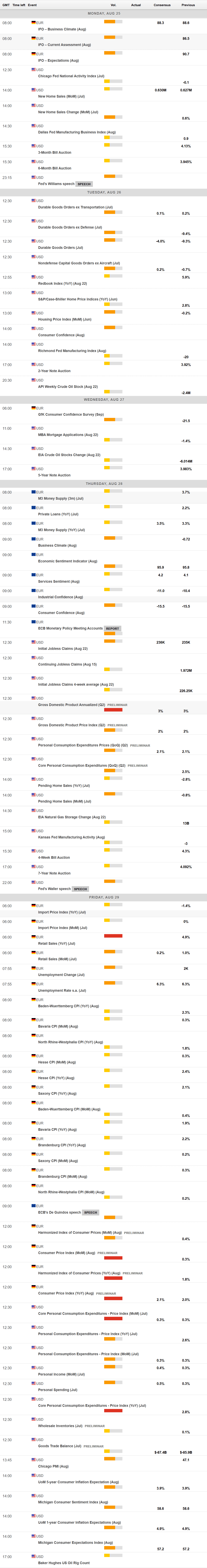 Los próximos días serán más ligeros en términos de datos macroeconómicos, con el calendario de Estados Unidos teniendo poco que ofrecer. El país publicará los pedidos de bienes duraderos el martes y la segunda estimación del Producto Interno Bruto (PIB) del segundo trimestre el jueves. Al final de la semana, EE.UU. publicará los datos del Índice de Precios del Gasto en Consumo Personal (PCE) de julio, el indicador de inflación favorito de la Fed.