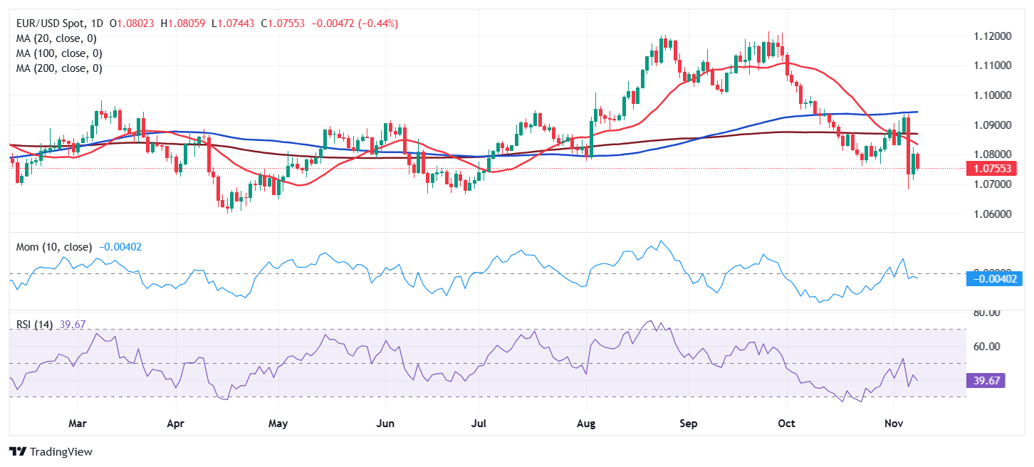 El EUR/USD cotiza aproximadamente 200 pips por debajo de su pico de noviembre en 1.0936 y las lecturas técnicas en el gráfico semanal sugieren que los vendedores tienen el control total. El par encontró vendedores alrededor de una media móvil simple (SMA) de 20 plana mientras caía por debajo de una SMA de 100 también sin dirección. La SMA de 200, mientras tanto, gana tracción bajista por encima de las más cortas, en línea con el aumento de la presión bajista. Finalmente, los indicadores técnicos se dirigen firmemente hacia el sur dentro de niveles negativos y en sus niveles más bajos desde junio, anticipando mínimos más bajos por delante.